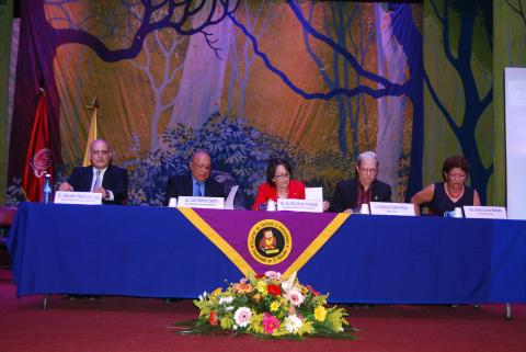 En la mesa de honor participaron: Msc. Ana María Glower de Alvarado, Vicerrectora de la Universidad de El Salvador; Lic. José Raymundo Calderón Morán, decano de la Facultad de Ciencias y Humanidades; Msc. Norma Cecilia Blandón, Vicedecana de la Facultad CC y HH; Dr. Salvador Eduardo Menéndez Leal, comentarista del estudio y Lic. Luis Sidney Blanco, autor de la investigación.